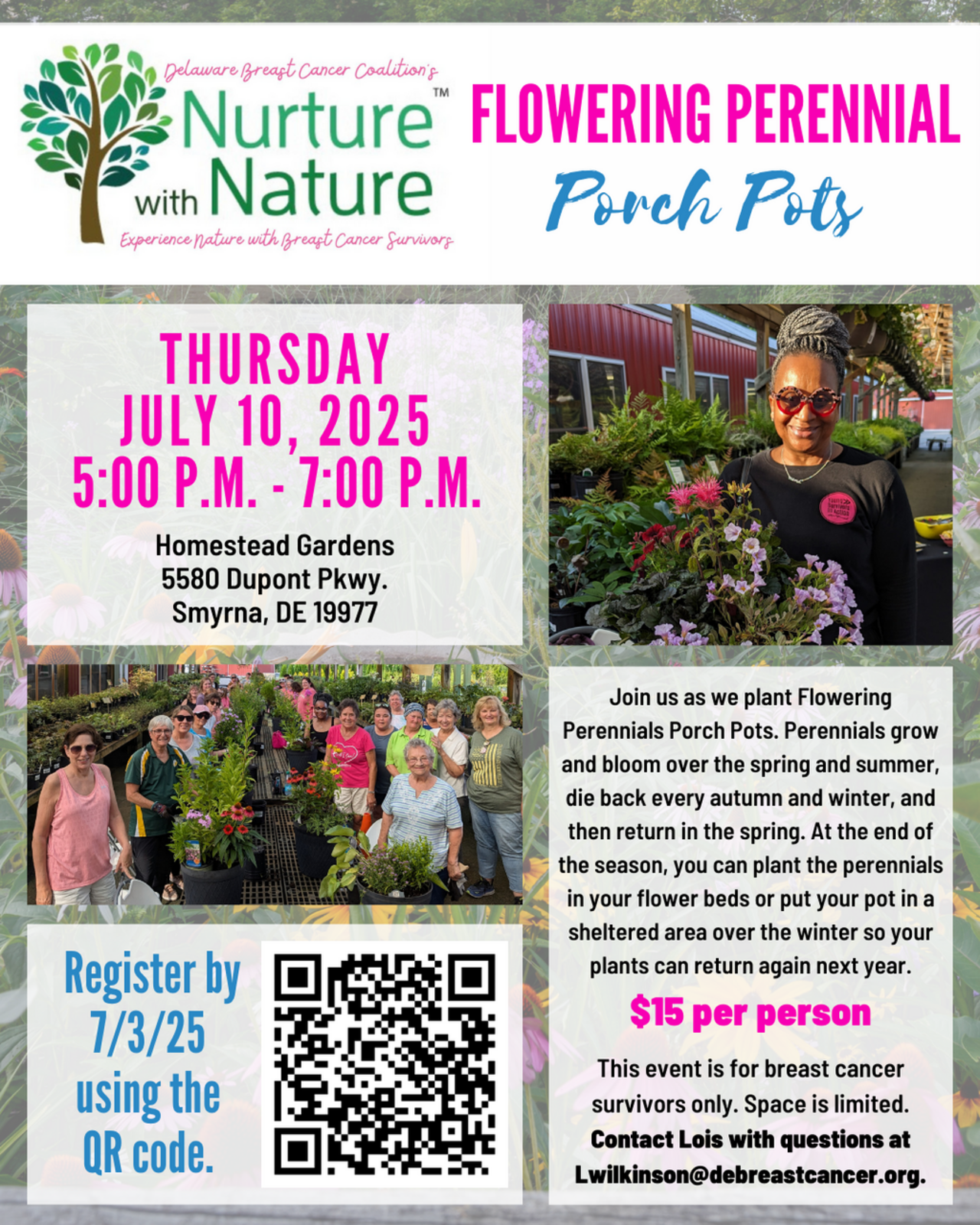 The vision of the Delaware Breast Cancer Coalition is to create a caring community where barriers to breast cancer screenings are removed and all persons at risk served by DBCC have access to quality care and treatment. DBCC will ensure each individual diagnosed receives resources to become a thriving survivor, armed with the knowledge and support needed to conquer this disease.