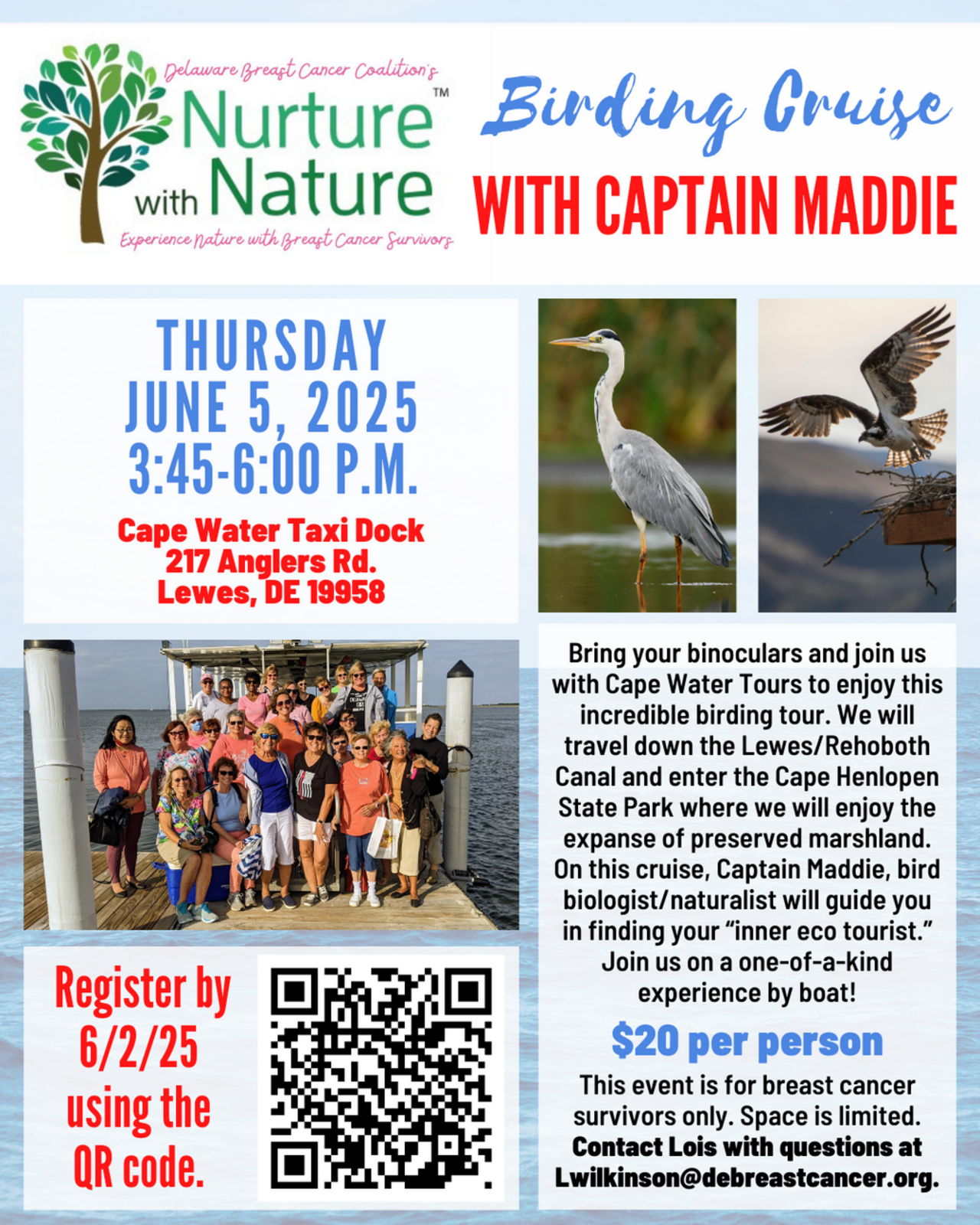 Bring your binoculars and join us with Cape Water Tours to enjoy this incredible Birding Tour. We will travel down the Lewes/Rehoboth Canal and enter the Cape Henlopen State Park where we will enjoy the expanse of preserved marshland. Watch as birds wade through the salt ponds catching fish and insects. Look high in the sky as bald eagles and osprey soar. Listen to the clapping of rails, the shrills of willets, and the chatter of red-winged blackbirds… and much more. On this cruise, Captain Maddie, bird biologist/naturalist will guide you in finding your “inner eco tourist.” By the end of this tour, you will have learned more about our local species and why our coastal habitat is so important to protect. Join us on a one-of-a-kind experience by boat!